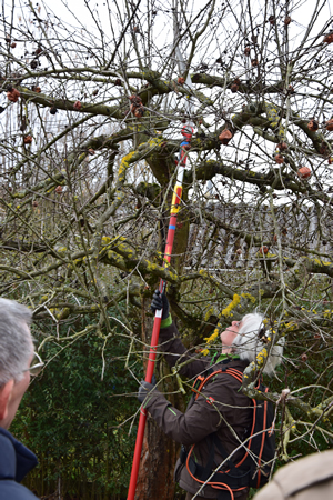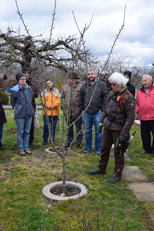einbringen und natürlich Fragen stellen. Unser Vorsitzender überreichte Frau Ziegler am Ende ihrer Ausführungen einen Blumenstrauß als ein kleines Dankeschön. Es war ja auch Internationaler Frauentag. Am Samstag folgte dann die praktische Anwendung der Theorie. Wie immer hatten einige Gartenfreunde dafür die Bäume in ihren Gärten zur Verfügung gestellt. Ca. 30 Personen folgten den Ausführungen. Schön, dass wir nicht nur Gartenfreunde, sondern auch Gäste begrüßen konnten. Die Aufteilung in einen theoretischen und praktischen Teil fand bei den Beteiligten einen positiven Anklang. Da es am Samstag ziemlich kühl und windig war, haben sich die Gäste die Schmalzbrote und den Glühwein zum Abschluss des Kurses munden lassen. Gisela Reinelt